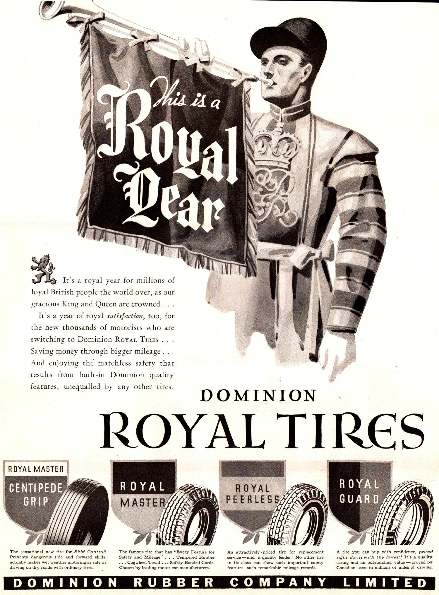 Connections to Canada’s royal heritage show up in all aspects of the auto industry. A 1937 ad from Montreal-based Dominion Rubber Company, celebrating the coronation of King George VI.